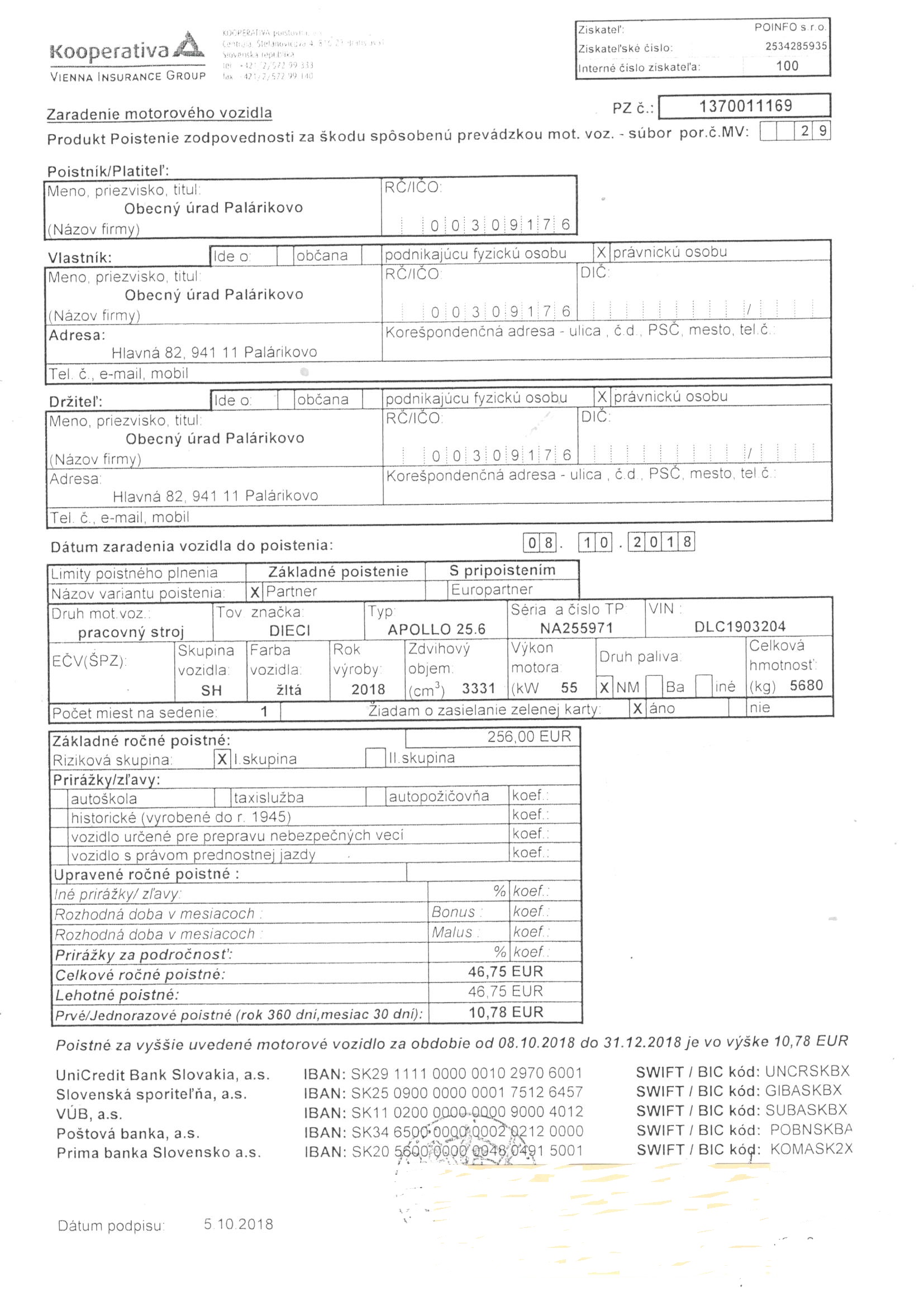 - Poistenie zodpovednosti za škodu spôsobenú prevádzkou motorového vozidla