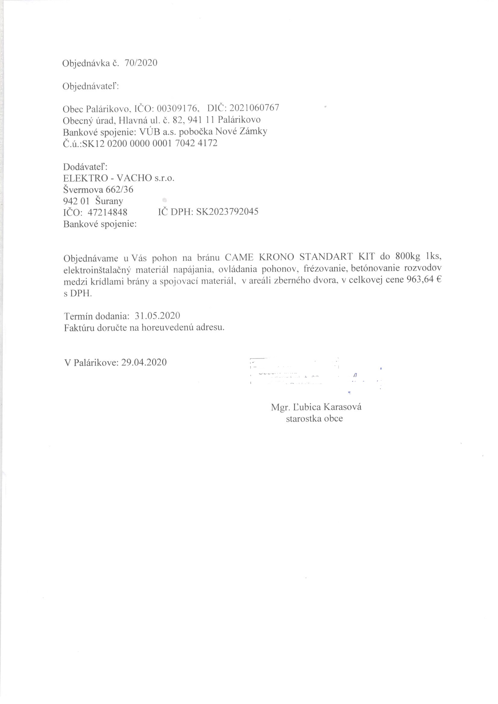 - Pohon na bránu, elektroinštalačný materiál napájania, ovládania pohonov, frézovanie, betónovanie rozvodov medzi krídlami brány a spojovací materiál v areáli zberného dvora