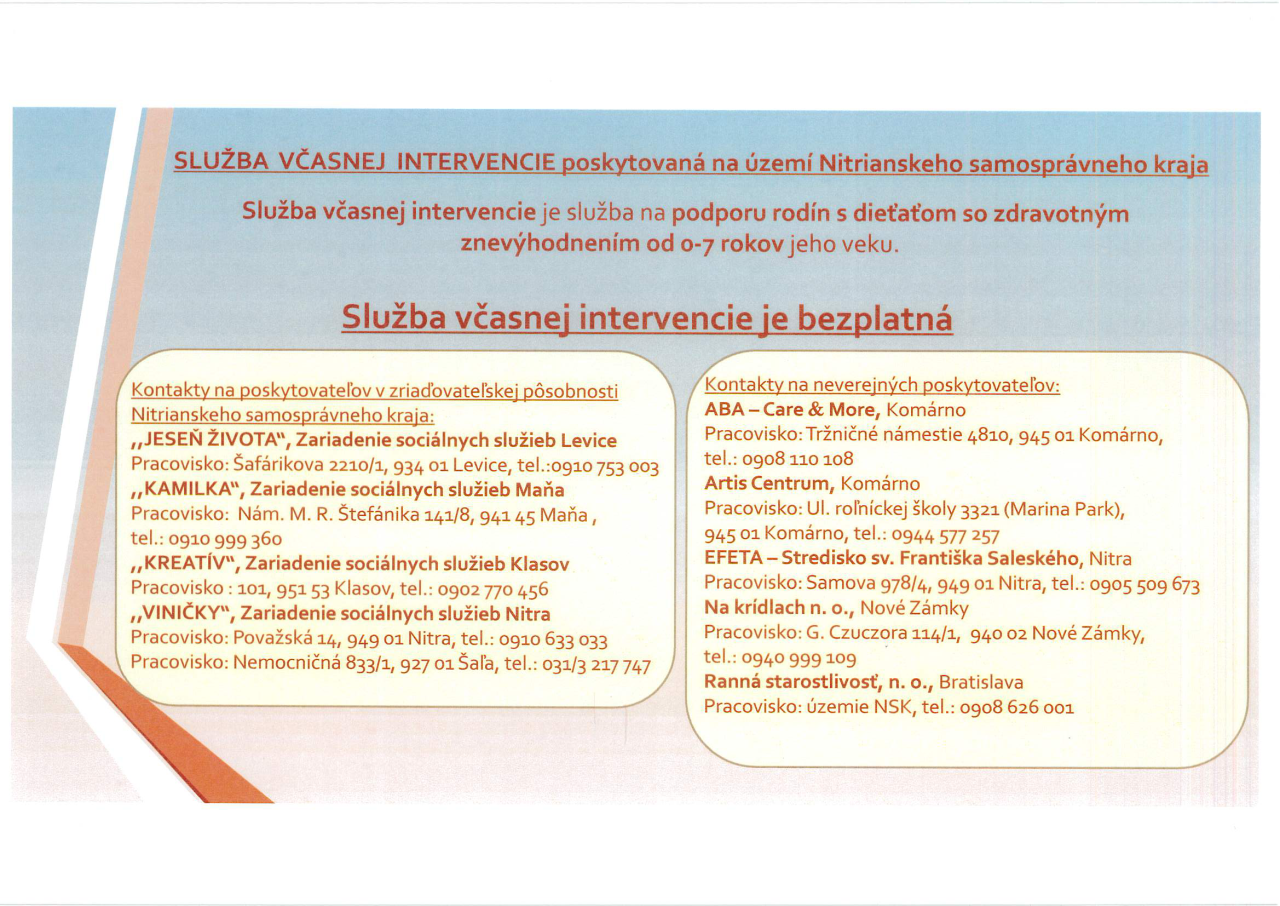 Služba včasnej intervencie je určená pre rodiny, ktoré sa starajú o deti so zdravotným znevýhodnením vo veku do 7 rokov. Tento program ponúka bezplatnú pomoc a podporu v rôznych oblastiach. Poskytovatelia služby v Nitrianskom samosprávnom kraji zahŕňajú niekoľko zariadení, ktoré sú rozmiestnené v rôznych mestách, ako sú Komárno, Levice a Nitra. Rodičia môžu využiť služby ako je ABA — Care, „Jeseň života“, „Kamilka“, „Kreatív“ a ďalšie, pričom každé zariadenie ponúka špecifické služby a odbornú pomoc. Pre viac informácií a kontakty sú uvedené telefónne čísla na jednotlivé pracoviská.